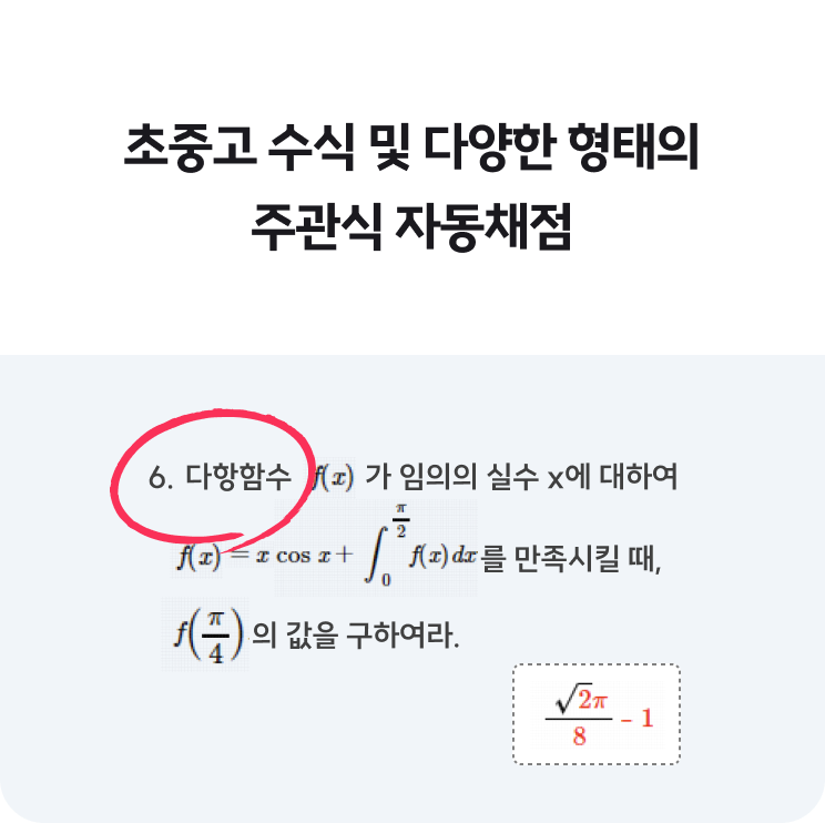 메타수학은 유일하게 수식 답안을 포함하여 다양한 형태의 주관식까지 자동 채점이 가능합니다.
